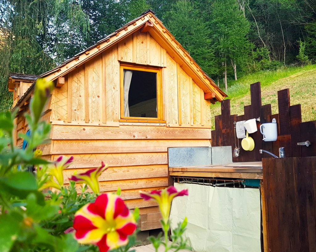 Nos cabanes sont fabriquées avec du bois issu de forêts gérées durablement. Le toit est couvert avec des tavaillons.